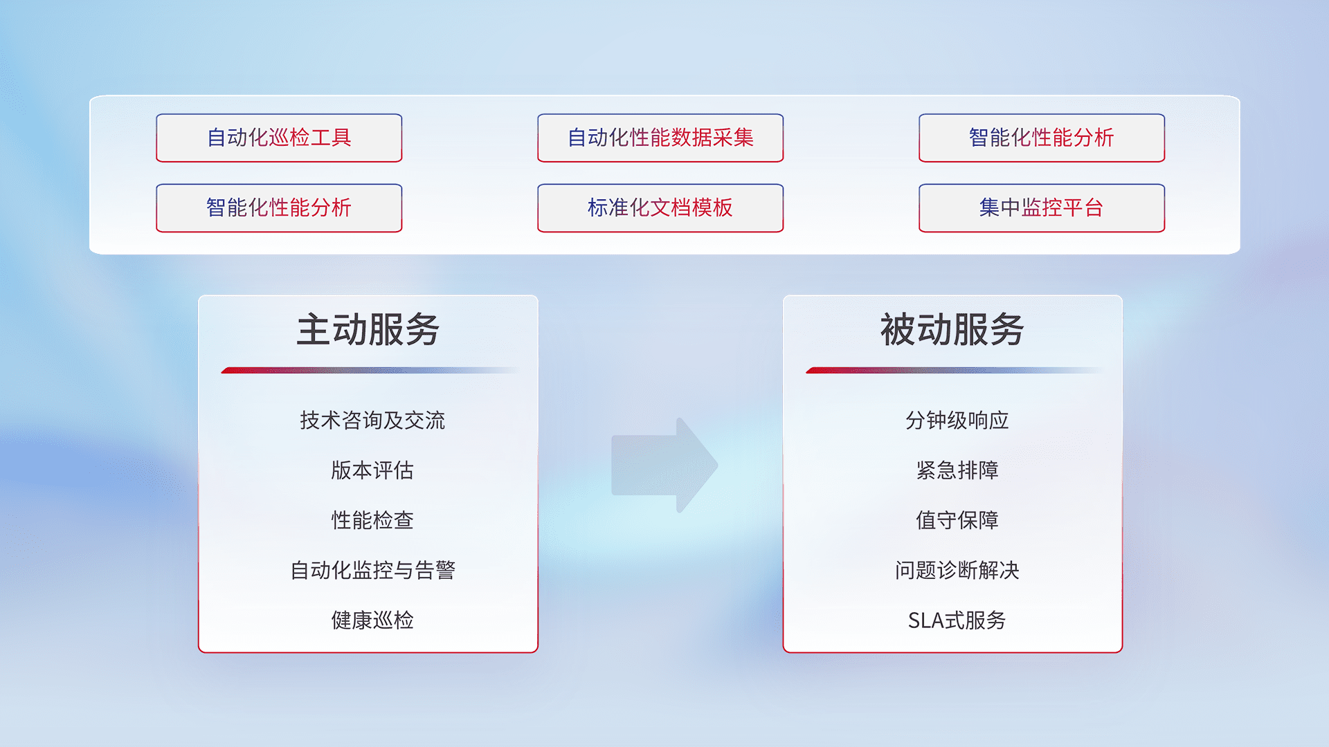智能化工具和标准化文档,,,,保障服务质量,,提供主动服务(包含技术咨询、、、版本评估、、性能检查、、、、自动化监控与告警、、、健康巡检)和被动服务包含(分钟级响应、、、、紧急排障、、、、值守保障、、、问题诊断解决、、、、SLA服务)。。。